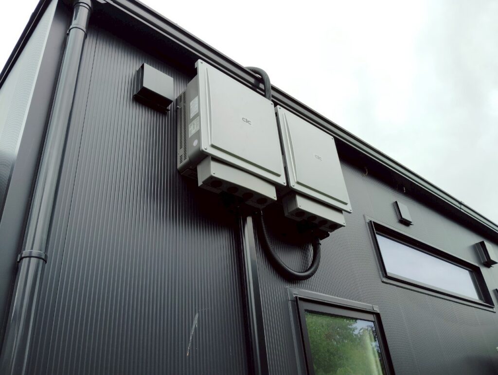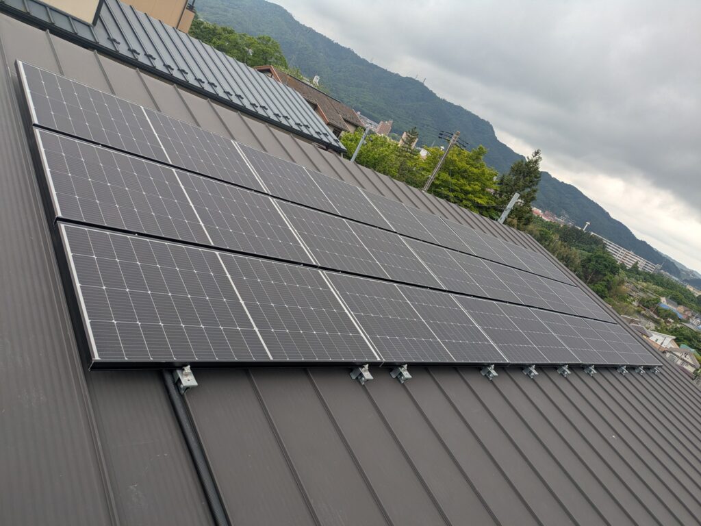 今回の施工では、屋根形状に合わせて発電効率を考慮しながら太陽光パネルを設置。外壁にはパワーコンディショナを取り付け、屋外には蓄電池ユニットを設置しました。